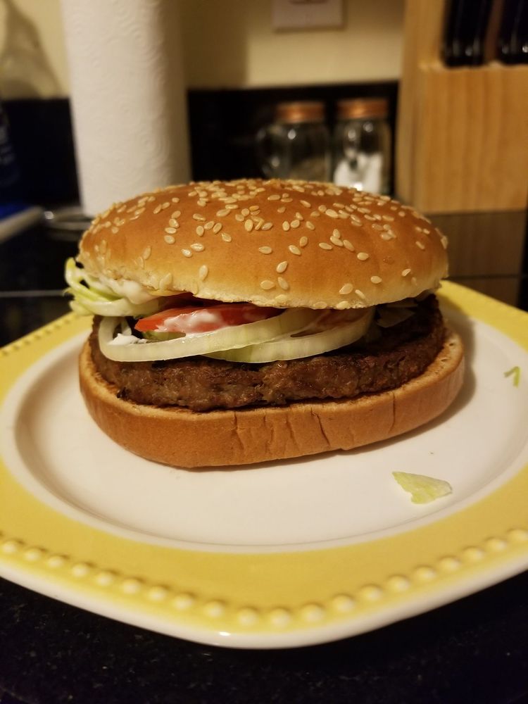 A flamegrilled, plantbased patty with juicy tomatoes, crisp lettuce, creamy mayonnaise, ketchup, crunchy pickles, and sliced white onions on a toasted sesame seed bun.